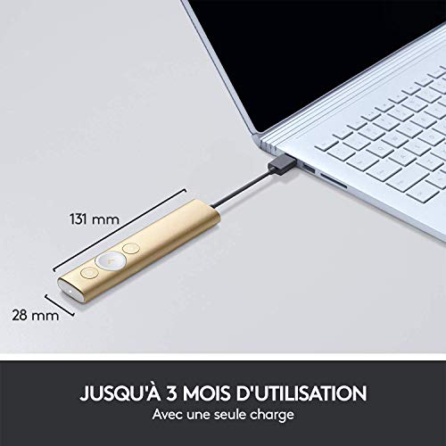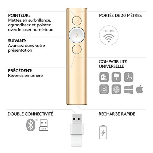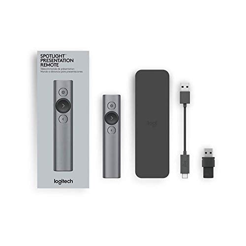 Logitech Spotlight Télécommande de Présentation sans Fil, Bluetooth et 2,4 GHz avec Nano-Récepteur USB, Pointeur Laser, Commandes de Diaporama, Portée de 30M, Minuterie Réglable, PC/Mac/Android - Gris